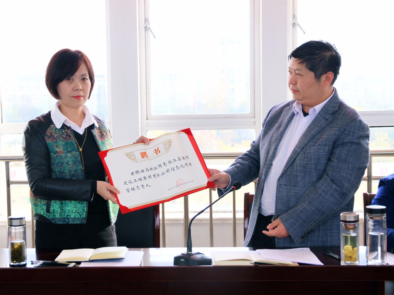 李锦柱总经理作了动员讲话并向集团信息化管理工作负责人马跃红颁发聘书。李锦柱总经理就集团经营管理现状及信息化工作的必要性作了说明,就新时代新形势下集团信息化平台建设做出部署和提出要求,一是通过信息化建设,实现集团财务管理、资金管理、项目管理、人力资源管理、协同办公管理等信息化,二是物力财力上保证投入,建立奖惩考核机制,三是建立工作例会制度,信息化实施小组每周以书面形式向领导小组汇报工作进展情况。